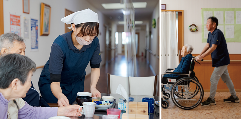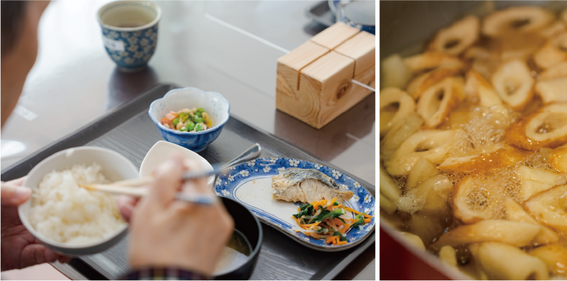 調理スタッフが利用者様の好みに合わせた献立を作成し、朝昼晩3食を手作りで調理しております。また、一人ひとりの飲み込みの状態に合わせてミキサー食や刻み食などをご用意しています。その他にも、施設で季節の行事に合わせた特別な献立も提供しております。
